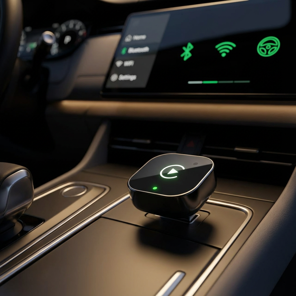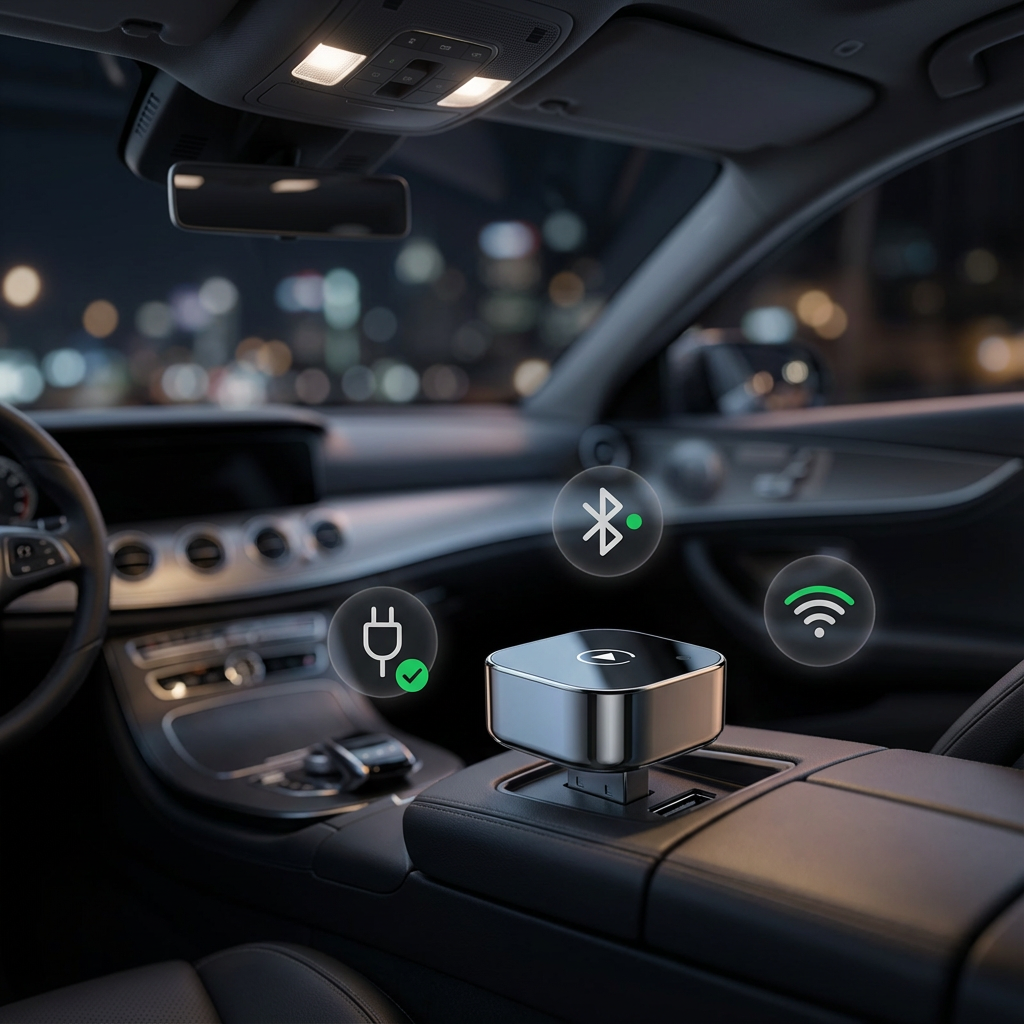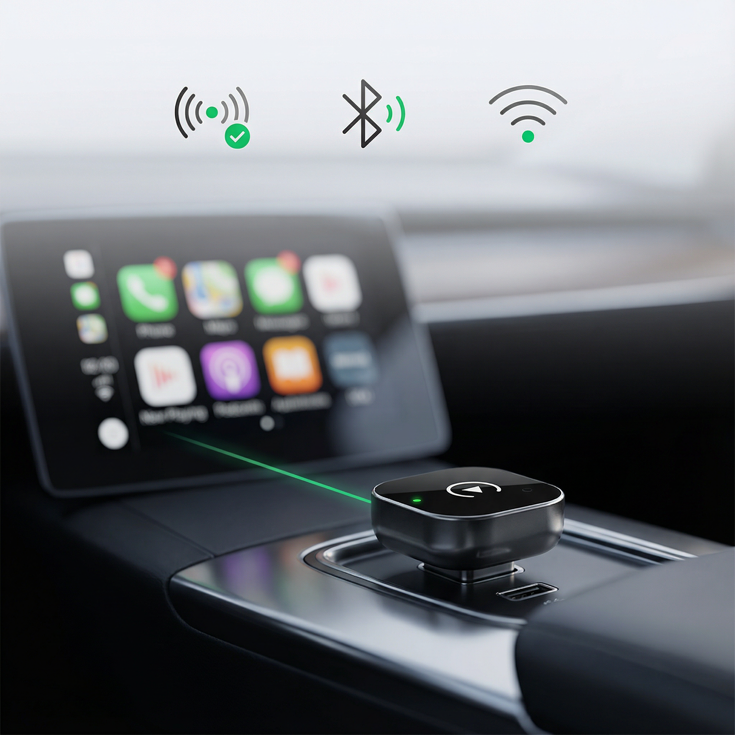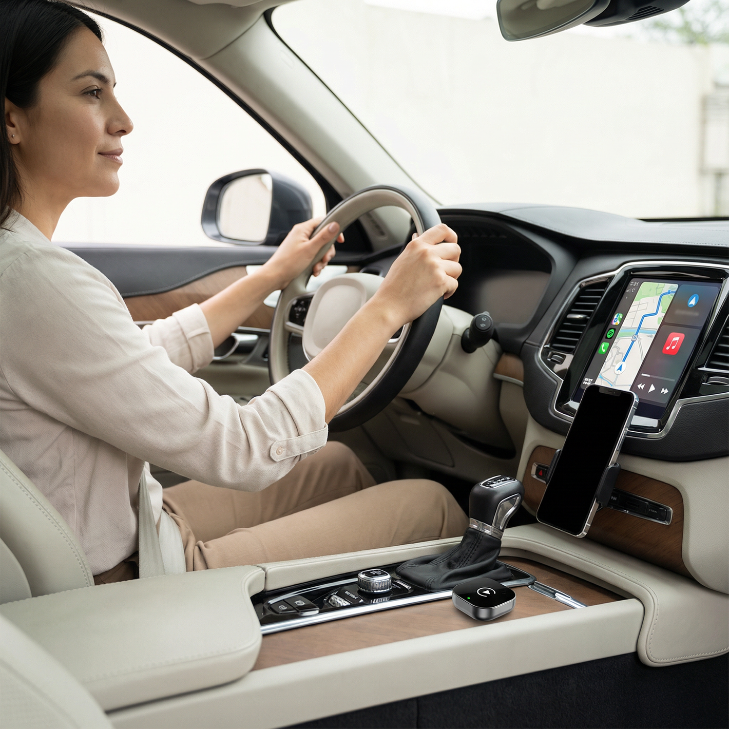 Olvídate del cable. Conecta una vez, y desde ahí CarPlay/Android Auto se activan solos. Cabina más limpia, menos fricción y más comodidad diaria. Solo para autos con CarPlay/Android Auto por cable (OEM).